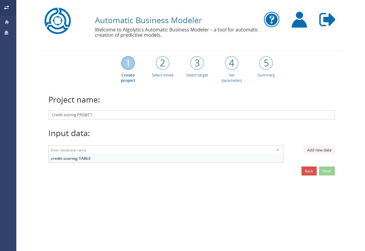 Then indicate the file that will be used to build your model. You can do this by choosing already imported files from the list. If there is no data available or you want to import new data, click the Add new data button and follow the steps described in the Chapter Importing files.