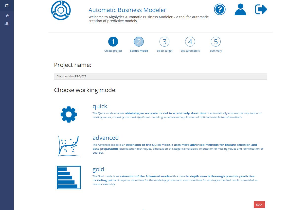 The Advanced mode is an extension of the Quick mode. It uses more advanced methods for feature selection and data preparation (discretization techniques, binarization of categorical variables, imputation of missing values, and identification of outliers)