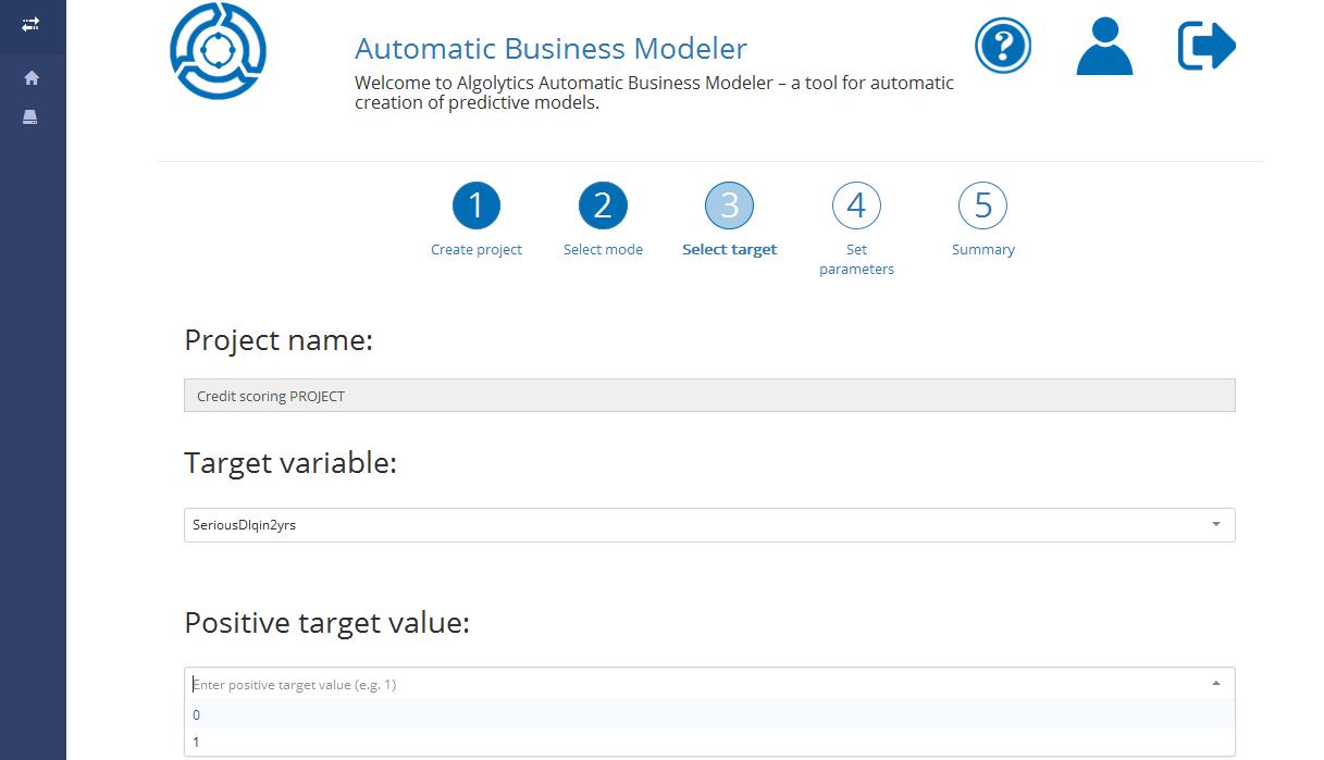 Choose a target variable (e.g. TARGET) and define what is a positive value of the target variable (e.g.: 1)