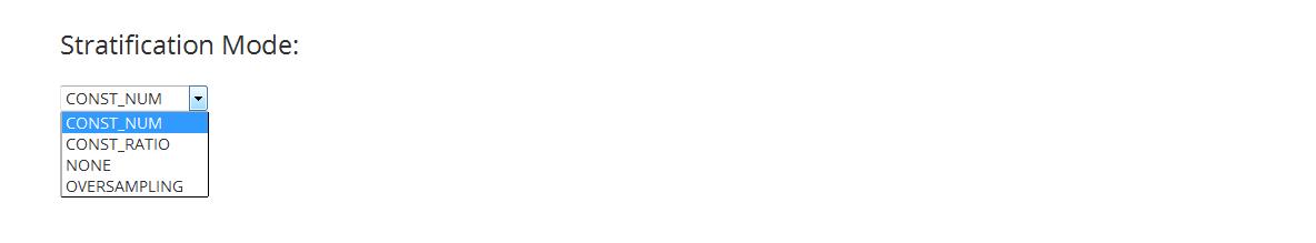 Stratification Mode: ABM supports the use of stratified sampling. This is especially useful when the proportion of the positive target values is small within the data set. The user can determine the ABM behaviour in case it is not possible to ensure both the specified sample size (user specified: Sample Size) and the proportion of positive target values (user specified: Positive Target Category Ratio). The following modes are available (default: CONST_NUM):