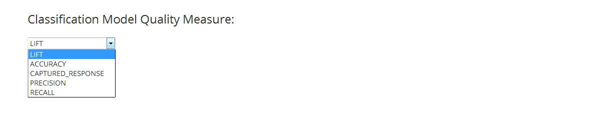 Classification Model Quality Measure: the user can select the best way of measuring model quality (default: LIFT)
