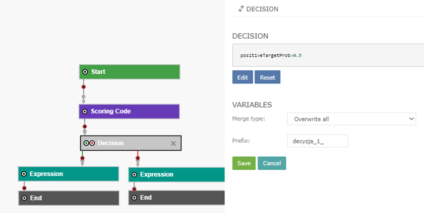 Decision node is used to divide the scenario depending on a decision. Node consists of an area with a Java code and 2 buttons: Edit and Reset. The Edit button opens a window to edit the code, the Reset button deletes the code. I n the node user also defines merge type of variables added by this node and a prefix of these variables. To divide a scenario, enter a condition in the Java code area and connect 2 nodes to the Decision node - one node must be connected to the node's green dot (it will execute when the condition is fulfilled), and the other node must be connected to the node's red dot (it will execute when the condition is not fulfilled). Connections are marked by a green and red line respectively.
